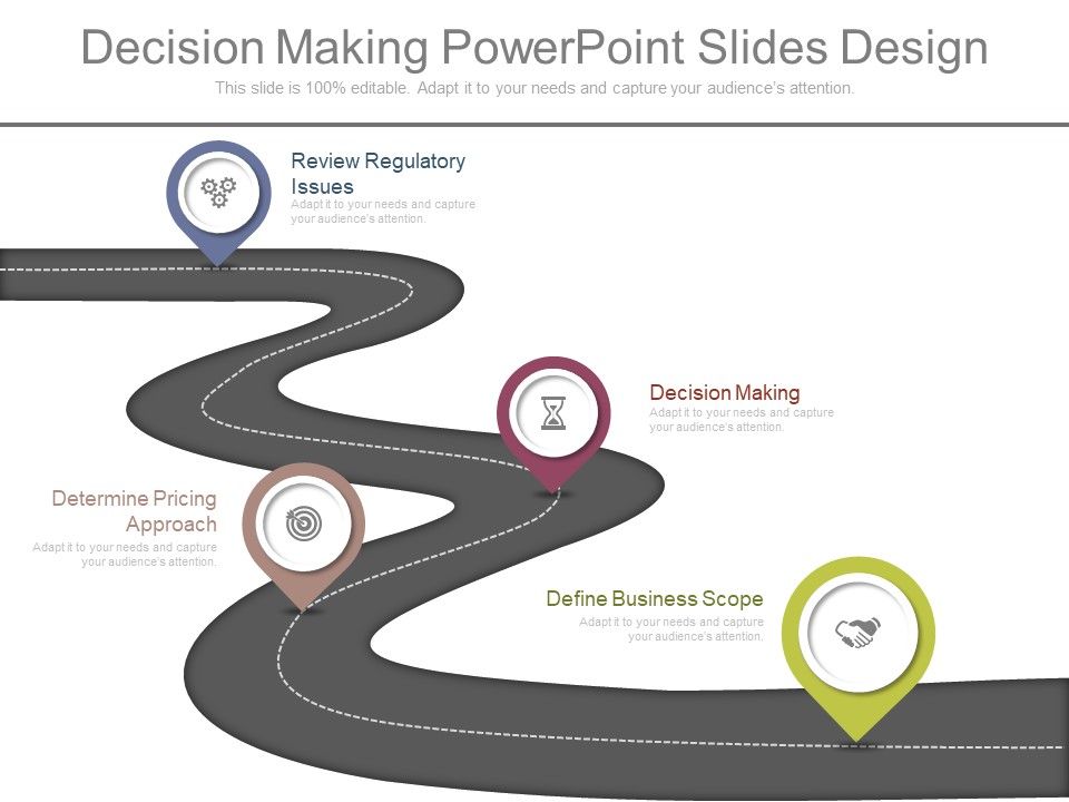 This is a decision making powerpoint slides design. This is a four stage process. The stages in this process are define business scope, determine pricing approach, decision making, review regulatory issues.