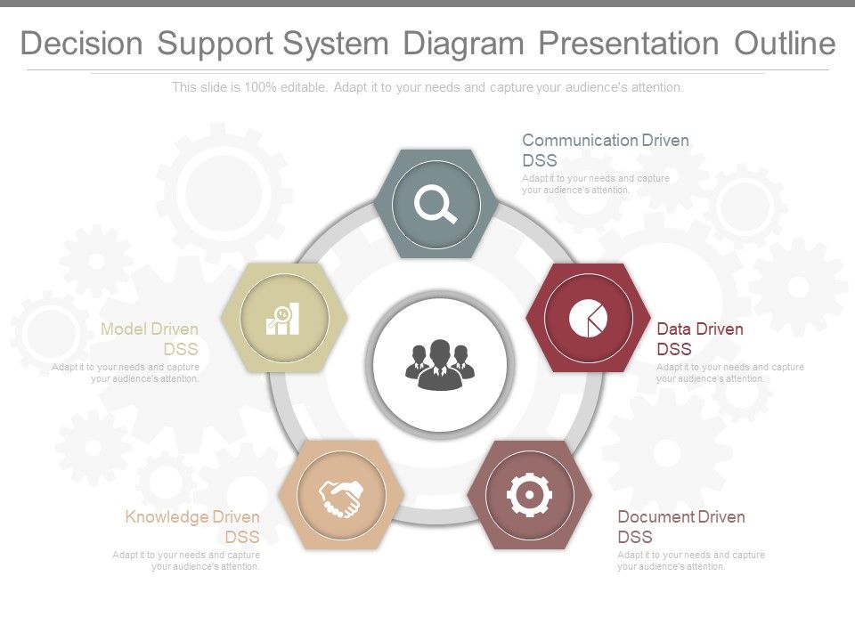 This is a decision support system diagram presentation outline. This is a five stage process. The stages in this process are communication driven dss, data driven dss, document driven dss, knowledge driven dss, model driven dss.