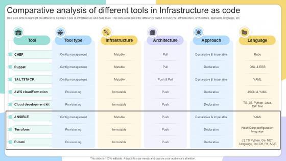 This slide aims to highlight the difference between types of infrastructure and code tools. This slide represents the difference based on tool type, infrastructure, architecture, approach, language, etc. If you are looking for a format to display your unique thoughts, then the professionally designed Comparative Analysis Of Different IAC Tools For Performance Analysis PPT PowerPoint is the one for you. You can use it as a Google Slides template or a PowerPoint template. Incorporate impressive visuals, symbols, images, and other charts. Modify or reorganize the text boxes as you desire. Experiment with shade schemes and font pairings. Alter, share or cooperate with other people on your work. Download Comparative Analysis Of Different IAC Tools For Performance Analysis PPT PowerPoint and find out how to give a successful presentation. Present a perfect display to your team and make your presentation unforgettable.