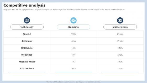 The purpose of this slide is to highlight competitive analysis of our company with other industry leaders. Information covered in this slide is related to company names, domains, and total market share. Want to ace your presentation in front of a live audience Our Competitive Analysis Capital Raising Pitch Deck For Advertising Services PPT Presentation can help you do that by engaging all the users towards you. Slidegeeks experts have put their efforts and expertise into creating these impeccable powerpoint presentations so that you can communicate your ideas clearly. Moreover, all the templates are customizable, and easy-to-edit and downloadable. Use these for both personal and commercial use.