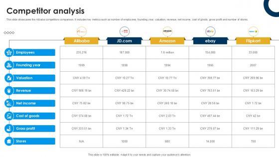 This slide showcases the Alibaba competitors comparison. It includes key metrics such as number of employees, founding year, valuation, revenue, net income, cost of goods, gross profit and number of stores. From laying roadmaps to briefing everything in detail, our templates are perfect for you. You can set the stage with your presentation slides. All you have to do is download these easy-to-edit and customizable templates. Competitor Analysis International Trade Of Products And Services PPT Sample CP SS V will help you deliver an outstanding performance that everyone would remember and praise you for. Do download this presentation today.
