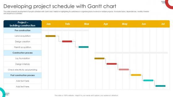 This slide presents development of project schedule with Gantt chart, helpful in highlighting its usefulness in organising tasks involved in multiple projects. It includes tasks, dependencies, monthly timeline and sequence of activities. Whether you have daily or monthly meetings, a brilliant presentation is necessary. Developing Project Schedule With Schedule Management Techniques PPT Template can be your best option for delivering a presentation. Represent everything in detail using Developing Project Schedule With Schedule Management Techniques PPT Template and make yourself stand out in meetings. The template is versatile and follows a structure that will cater to your requirements. All the templates prepared by Slidegeeks are easy to download and edit. Our research experts have taken care of the corporate themes as well. So, give it a try and see the results.