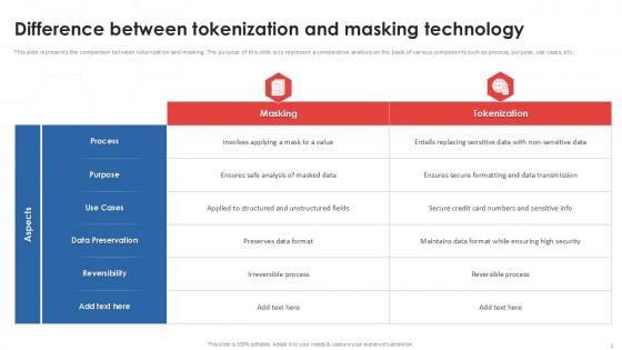 This slide represents the comparison between tokenization and masking. The purpose of this slide is to represent a comparative analysis on the basis of various components such as process, purpose, use cases, etc. Find a pre-designed and impeccable Difference Between Tokenization And Masking Technology PPT Powerpoint. The templates can ace your presentation without additional effort. You can download these easy-to-edit presentation templates to make your presentation stand out from others. So, what are you waiting for Download the template from Slidegeeks today and give a unique touch to your presentation.