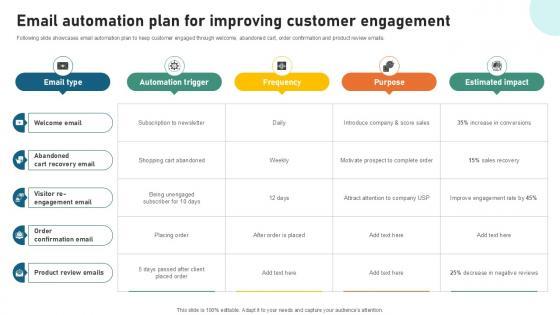 Following slide showcases email automation plan to keep customer engaged through welcome, abandoned cart, order confirmation and product review emails. Do you have an important presentation coming up Are you looking for something that will make your presentation stand out from the rest Look no further than Email Automation Plan For Sample Pitch Deck For Video Ppt Sample. With our professional designs, you can trust that your presentation will pop and make delivering it a smooth process. And with Slidegeeks, you can trust that your presentation will be unique and memorable. So why wait Grab Email Automation Plan For Sample Pitch Deck For Video Ppt Sample today and make your presentation stand out from the rest