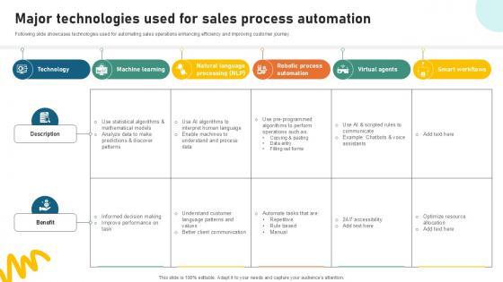 Following slide showcases technologies used for automating sales operations enhancing efficiency and improving customer journey. The best PPT templates are a great way to save time, energy, and resources. Slidegeeks have 100 percent editable powerpoint slides making them incredibly versatile. With these quality presentation templates, you can create a captivating and memorable presentation by combining visually appealing slides and effectively communicating your message. Download Major Technologies Used For Sales Sample Pitch Deck For Video Ppt Slide from Slidegeeks and deliver a wonderful presentation.