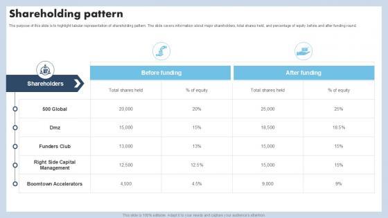 The purpose of this slide is to highlight tabular representation of shareholding pattern. The slide covers information about major shareholders, total shares held, and percentage of equity before and after funding round. This modern and well-arranged Shareholding Pattern Capital Raising Pitch Deck For Advertising Services PPT Example provides lots of creative possibilities. It is very simple to customize and edit with the Powerpoint Software. Just drag and drop your pictures into the shapes. All facets of this template can be edited with Powerpoint, no extra software is necessary. Add your own material, put your images in the places assigned for them, adjust the colors, and then you can show your slides to the world, with an animated slide included.