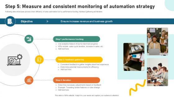 Following slide showcases process check efficiency of sales automation tool by performance tracking, feedback gathering and iteration. Are you searching for a Step 5 Measure And Consistent Sample Pitch Deck For Video Ppt Template that is uncluttered, straightforward, and original Its easy to edit, and you can change the colors to suit your personal or business branding. For a presentation that expresses how much effort you have put in, this template is ideal With all of its features, including tables, diagrams, statistics, and lists, its perfect for a business plan presentation. Make your ideas more appealing with these professional slides. Download Step 5 Measure And Consistent Sample Pitch Deck For Video Ppt Template from Slidegeeks today.