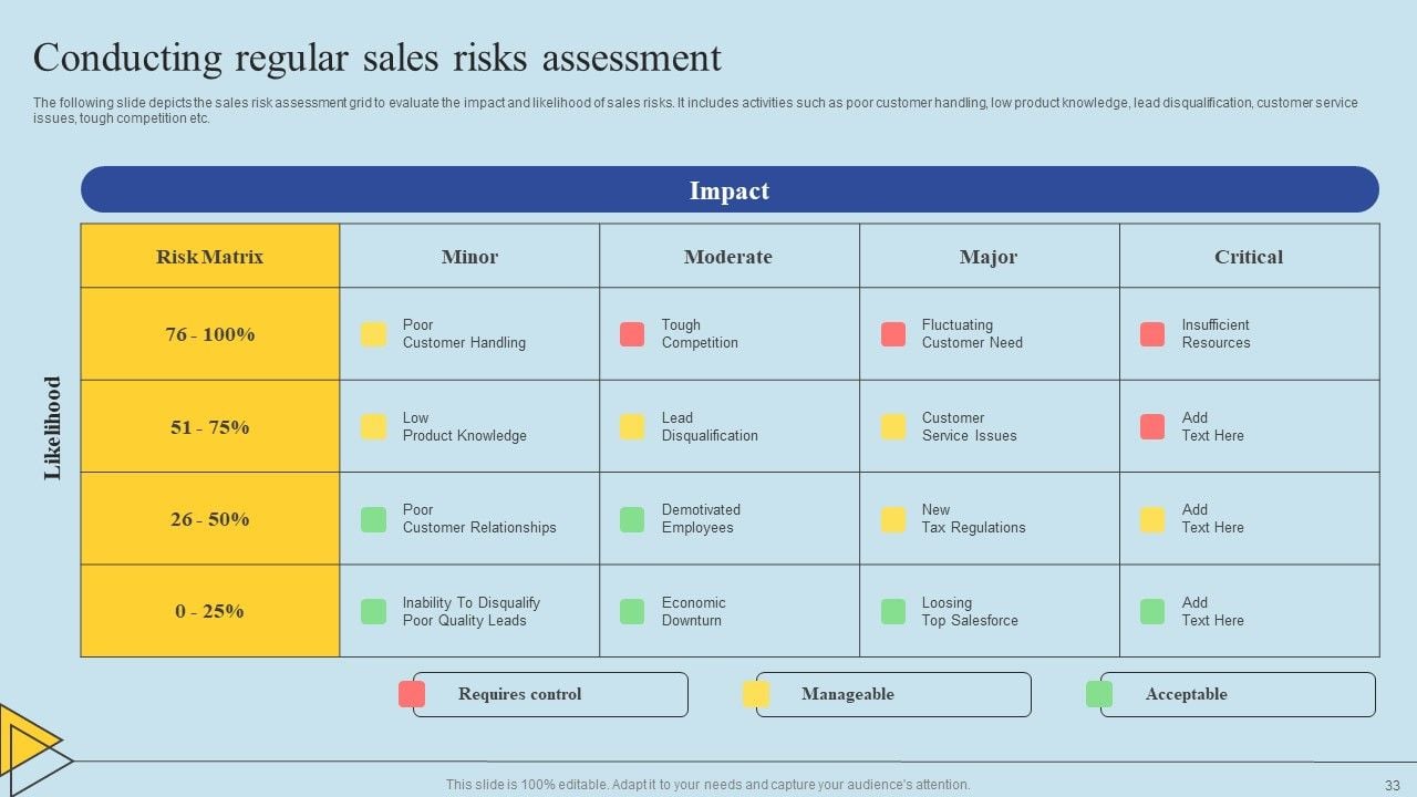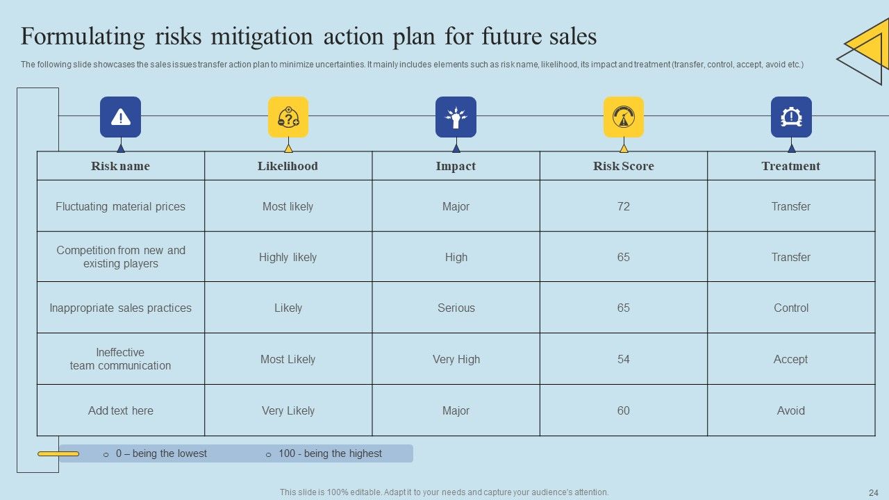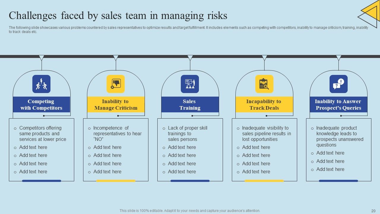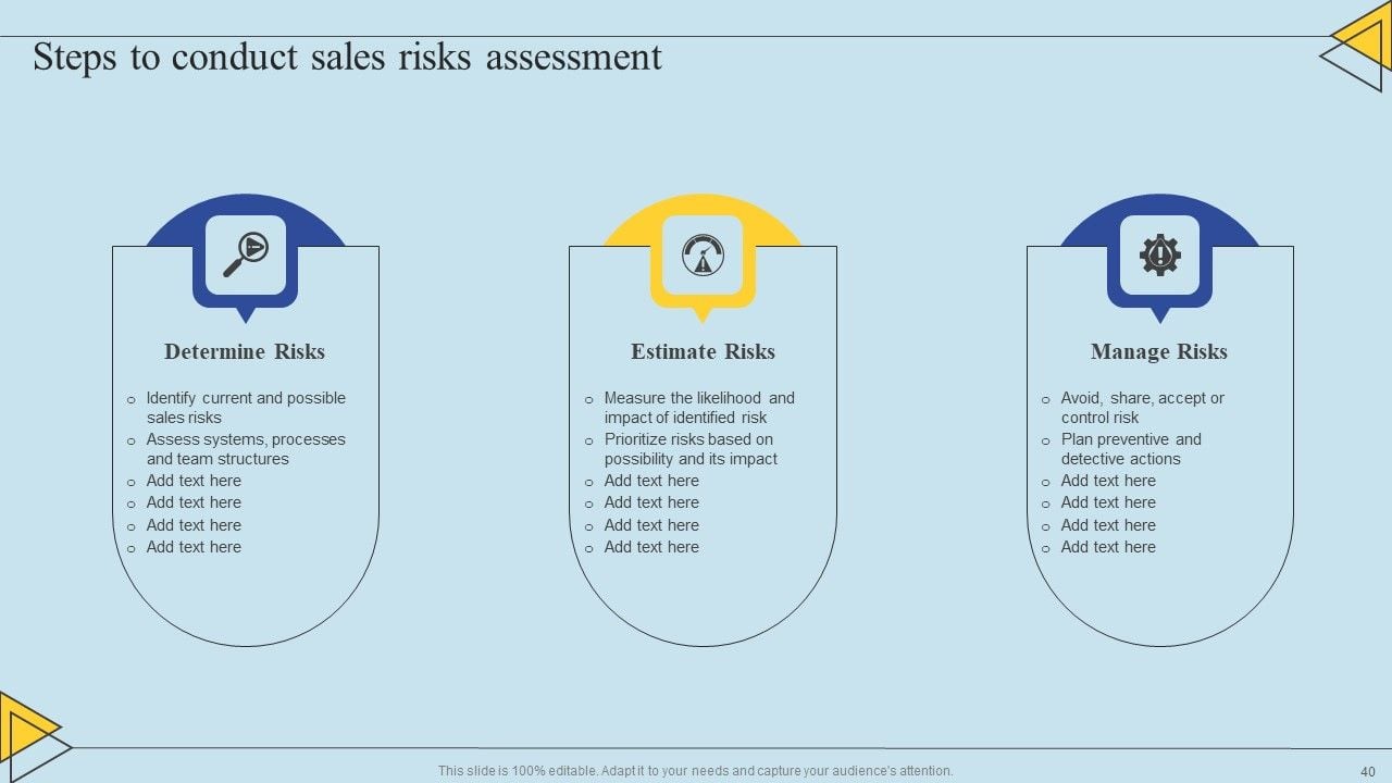 This Determining Risks In Sales Administration Procedure Ppt PowerPoint Presentation Complete Deck With Slides is designed to help you retain your audiences attention. This content-ready PowerPoint Template enables you to take your audience on a journey and share information in a way that is easier to recall. It helps you highlight the crucial parts of your work so that the audience does not get saddled with information download. This fifty six slide PPT Deck comes prepared with the graphs and charts you could need to showcase your information through visuals. You only need to enter your own data in them. Download this editable PowerPoint Theme and walk into that meeting with confidence.