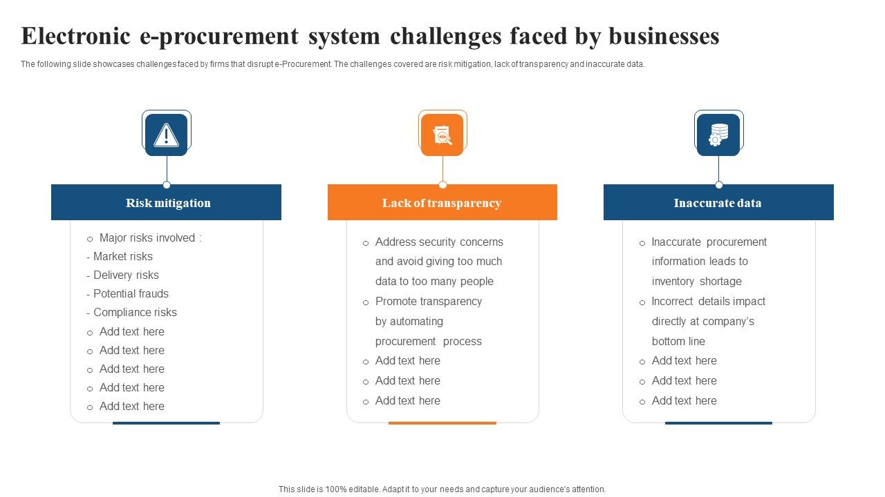 The following slide showcases challenges faced by firms that disrupt e Procurement. The challenges covered are risk mitigation, lack of transparency and inaccurate data. Persuade your audience using this Electronic E Procurement System Challenges Faced By Businesses Summary PDF. This PPT design covers three stages, thus making it a great tool to use. It also caters to a variety of topics including Lack Of Transparency, Inaccurate Data, Risk Mitigation. Download this PPT design now to present a convincing pitch that not only emphasizes the topic but also showcases your presentation skills.