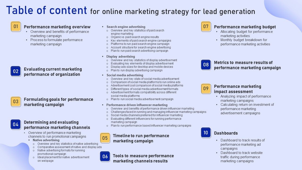 If you are looking for a format to display your unique thoughts, then the professionally designed Table Of Content For Online Marketing Strategy For Lead Generation Sample PDF is the one for you. You can use it as a Google Slides template or a PowerPoint template. Incorporate impressive visuals, symbols, images, and other charts. Modify or reorganize the text boxes as you desire. Experiment with shade schemes and font pairings. Alter, share or cooperate with other people on your work. Download Table Of Content For Online Marketing Strategy For Lead Generation Sample PDF and find out how to give a successful presentation. Present a perfect display to your team and make your presentation unforgettable.