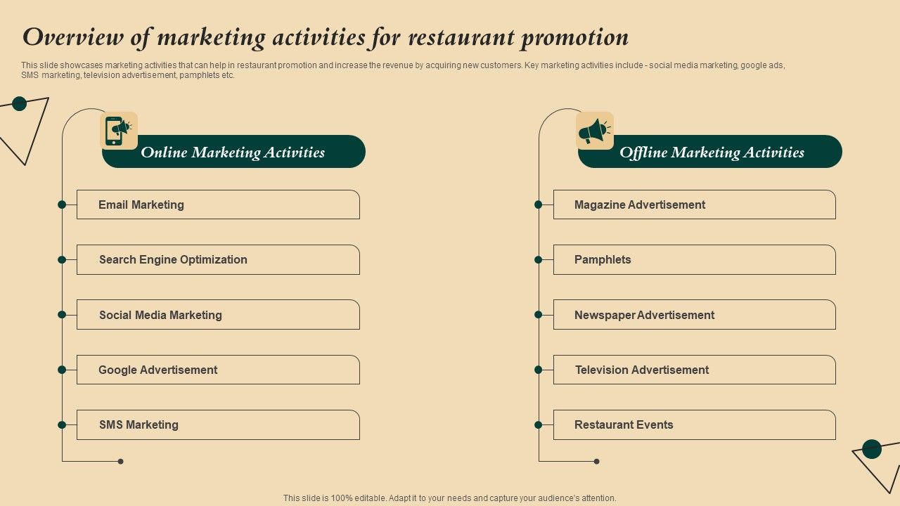 This slide showcases marketing activities that can help in restaurant promotion and increase the revenue by acquiring new customers. Key marketing activities include - social media marketing, google ads,SMS marketing, television advertisement, pamphlets etc. Are you searching for a Coffeehouse Promotion Techniques To Boost Revenue Overview Of Marketing Activities Restaurant Topics PDF that is uncluttered, straightforward, and original Its easy to edit, and you can change the colors to suit your personal or business branding. For a presentation that expresses how much effort you have put in, this template is ideal With all of its features, including tables, diagrams, statistics, and lists, its perfect for a business plan presentation. Make your ideas more appealing with these professional slides. Download Coffeehouse Promotion Techniques To Boost Revenue Overview Of Marketing Activities Restaurant Topics PDF from Slidegeeks today.