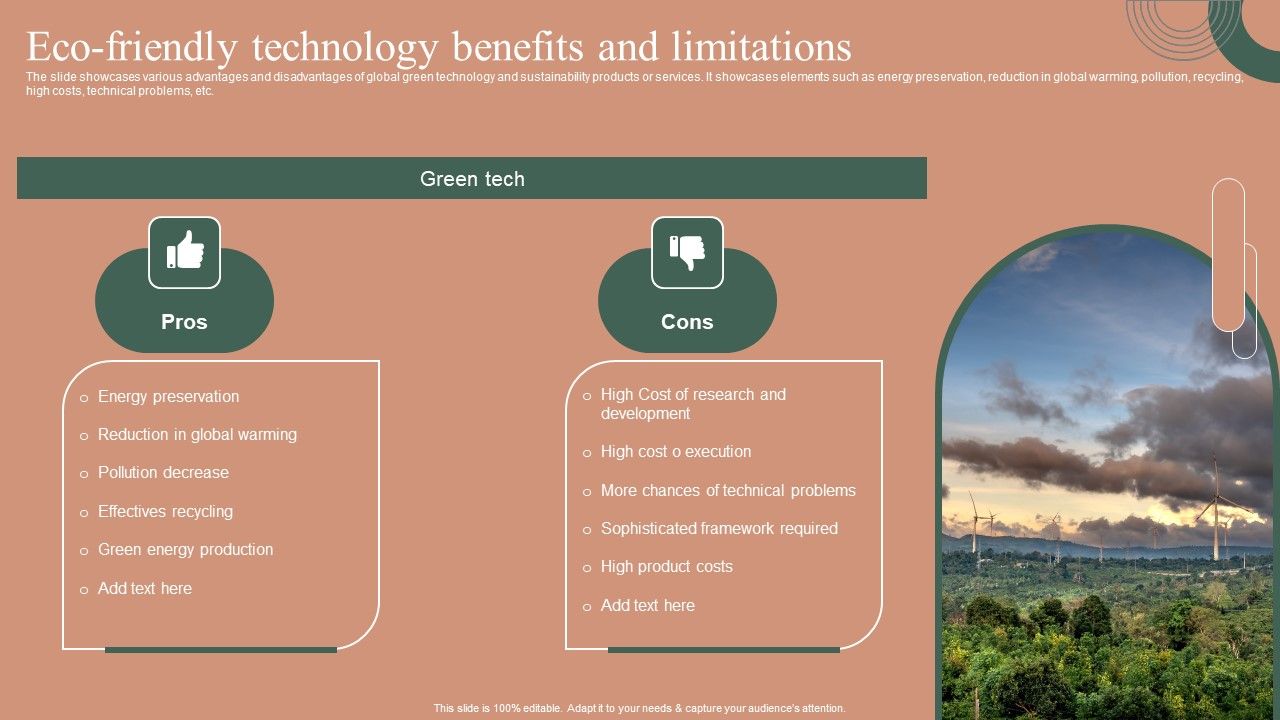 The slide showcases various advantages and disadvantages of global green technology and sustainability products or services. It showcases elements such as energy preservation, reduction in global warming, pollution, recycling, high costs, technical problems, etc. Do you have an important presentation coming up Are you looking for something that will make your presentation stand out from the rest Look no further than Eco Friendly Technology Benefits And Limitations Download PDF. With our professional designs, you can trust that your presentation will pop and make delivering it a smooth process. And with Slidegeeks, you can trust that your presentation will be unique and memorable. So why wait Grab Eco Friendly Technology Benefits And Limitations Download PDF today and make your presentation stand out from the rest