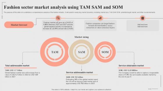 The purpose of this slide is to undertake a comprehensive analysis of the fashion industry. It will assist in analyzing market dynamics, including market size, TAM SAM SOM, potential target market, and other crucial elements. Formulating a presentation can take up a lot of effort and time, so the content and message should always be the primary focus. The visuals of the PowerPoint can enhance the presenters message, so our Fashion Sector Market Analysis Using Tam Sam And Som Fashion Startup Roadmap Plan Ppt Slide BP SS V was created to help save time. Instead of worrying about the design, the presenter can concentrate on the message while our designers work on creating the ideal templates for whatever situation is needed. Slidegeeks has experts for everything from amazing designs to valuable content, we have put everything into Fashion Sector Market Analysis Using Tam Sam And Som Fashion Startup Roadmap Plan Ppt Slide BP SS V The purpose of this slide is to undertake a comprehensive analysis of the fashion industry. It will assist in analyzing market dynamics, including market size, TAM SAM SOM, potential target market, and other crucial elements.