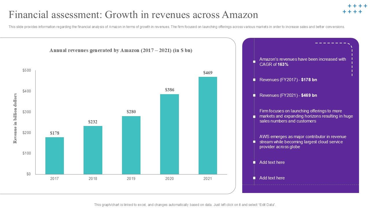 This slide provides information regarding the financial analysis of Amazon in terms of growth in revenues. The firm focused on launching offerings across various markets in order to increase sales and better conversions. Slidegeeks is one of the best resources for PowerPoint templates. You can download easily and regulate Financial Assessment Growth In Revenues Across Amazon Topics PDF for your personal presentations from our wonderful collection. A few clicks is all it takes to discover and get the most relevant and appropriate templates. Use our Templates to add a unique zing and appeal to your presentation and meetings. All the slides are easy to edit and you can use them even for advertisement purposes.