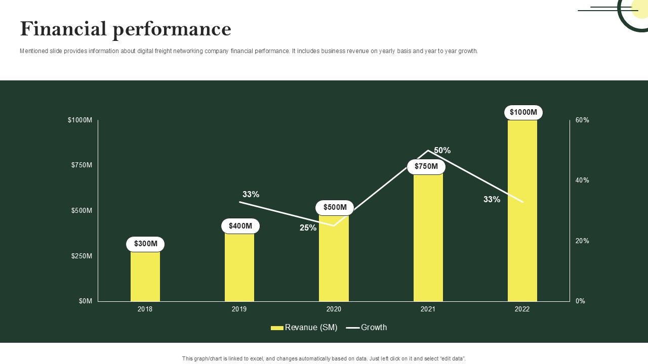 Mentioned slide provides information about digital freight networking company financial performance. It includes business revenue on yearly basis and year to year growth. This modern and well-arranged Financial Performance Logistic Company Investor Fund Raising Pitch Deck Designs PDF provides lots of creative possibilities. It is very simple to customize and edit with the Powerpoint Software. Just drag and drop your pictures into the shapes. All facets of this template can be edited with Powerpoint, no extra software is necessary. Add your own material, put your images in the places assigned for them, adjust the colors, and then you can show your slides to the world, with an animated slide included.