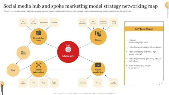 This slide showcase the social media hub and spoke marketing network map. It includes videos, knowledge sites, email marketing and social interactions on the main site with clients. Presenting Social Media Hub And Spoke Marketing Model Strategy Networking Map Mockup PDF to dispense important information. This template comprises one stages. It also presents valuable insights into the topics including Social Interaction, Knowledge Sites, Videos, Email Marketing . This is a completely customizable PowerPoint theme that can be put to use immediately. So, download it and address the topic impactfully.
