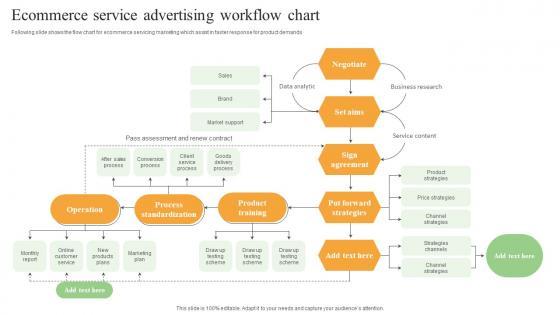 Following slide shows the flow chart for ecommerce servicing marketing which assist in faster response for product demands. Pitch your topic with ease and precision using this Ecommerce Service Advertising Workflow Chart Themes Pdf. This layout presents information on Business Research, Service Content, Product Training. It is also available for immediate download and adjustment. So, changes can be made in the color, design, graphics or any other component to create a unique layout.