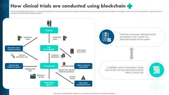 This slide highlights the prototype of conducting clinical trials in non familiar environment using blockchain technology. Key participants include patients, investigator, sponsor, research organizations, regulatory agency, monitoring board and data collection agency. Are you searching for a How Blockchain Is Reshaping How Clinical Trials Are Conducted Using Blockchain BCT SS V that is uncluttered, straightforward, and original Its easy to edit, and you can change the colors to suit your personal or business branding. For a presentation that expresses how much effort you have put in, this template is ideal With all of its features, including tables, diagrams, statistics, and lists, its perfect for a business plan presentation. Make your ideas more appealing with these professional slides. Download How Blockchain Is Reshaping How Clinical Trials Are Conducted Using Blockchain BCT SS V from Slidegeeks today.