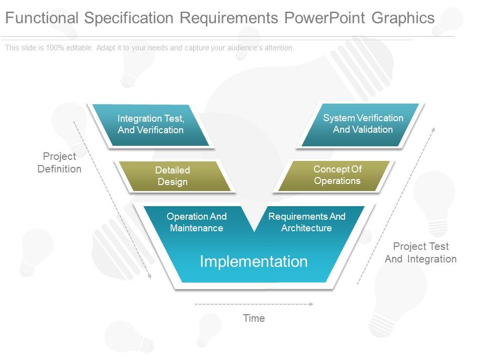This is a functional specification requirements powerpoint graphics. This is a one stage process. The stages in this process are integration test and verification, detailed design, system verification and validation, concept of operations, operation and maintenance, requirements and architecture, implementation.