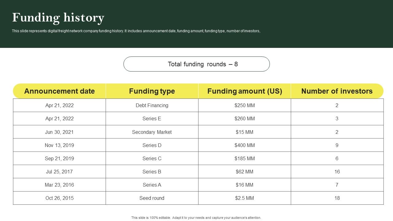 This slide represents digital freight network company funding history. It includes announcement date, funding amount, funding type, number of investors. Do you have to make sure that everyone on your team knows about any specific topic I yes, then you should give Funding History Logistic Company Investor Fund Raising Pitch Deck Diagrams PDF a try. Our experts have put a lot of knowledge and effort into creating this impeccable Funding History Logistic Company Investor Fund Raising Pitch Deck Diagrams PDF. You can use this template for your upcoming presentations, as the slides are perfect to represent even the tiniest detail. You can download these templates from the Slidegeeks website and these are easy to edit. So grab these today