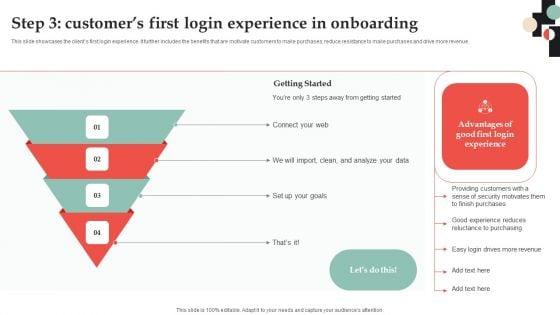 This slide showcases the clients first login experience. It further includes the benefits that are motivate customers to make purchases, reduce resistance to make purchases and drive more revenue. The best PPT templates are a great way to save time, energy, and resources. Slidegeeks have 100 percent editable powerpoint slides making them incredibly versatile. With these quality presentation templates, you can create a captivating and memorable presentation by combining visually appealing slides and effectively communicating your message. Download Techniques To Enhance User Onboarding Journey Step 3 Customers First Login Experience In Onboarding Guidelines PDF from Slidegeeks and deliver a wonderful presentation.