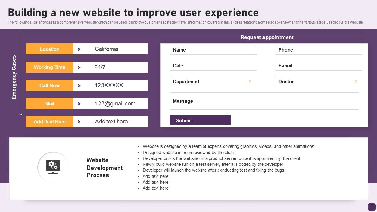 The following slide showcases a comprehensive website which can be used to improve customer satisfaction level. Information covered in this slide is related to home page overview and the various steps used to build a website. Do you have an important presentation coming up Are you looking for something that will make your presentation stand out from the rest Look no further than Guide To Healthcare Services Administration Building A New Website To Improve User Experience Information PDF. With our professional designs, you can trust that your presentation will pop and make delivering it a smooth process. And with Slidegeeks, you can trust that your presentation will be unique and memorable. So why wait Grab Guide To Healthcare Services Administration Building A New Website To Improve User Experience Information PDF today and make your presentation stand out from the rest.