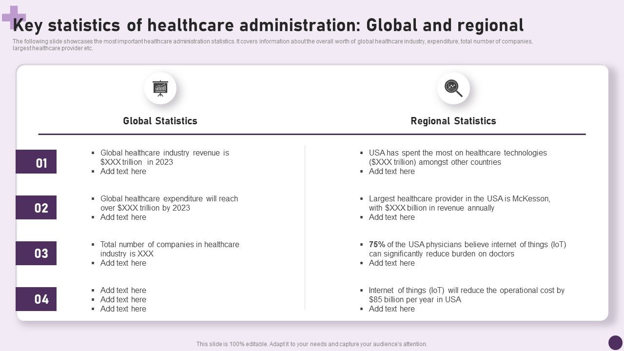 The following slide showcases the most important healthcare administration statistics. It covers information about the overall worth of global healthcare industry, expenditure, total number of companies, largest healthcare provider etc. Presenting this PowerPoint presentation, titled Guide To Healthcare Services Administration Key Statistics Of Healthcare Administration Global And Regional Topics PDF, with topics curated by our researchers after extensive research. This editable presentation is available for immediate download and provides attractive features when used. Download now and captivate your audience. Presenting this Guide To Healthcare Services Administration Key Statistics Of Healthcare Administration Global And Regional Topics PDF. Our researchers have carefully researched and created these slides with all aspects taken into consideration. This is a completely customizable Guide To Healthcare Services Administration Key Statistics Of Healthcare Administration Global And Regional Topics PDF that is available for immediate downloading. Download now and make an impact on your audience. Highlight the attractive features available with our PPTs.