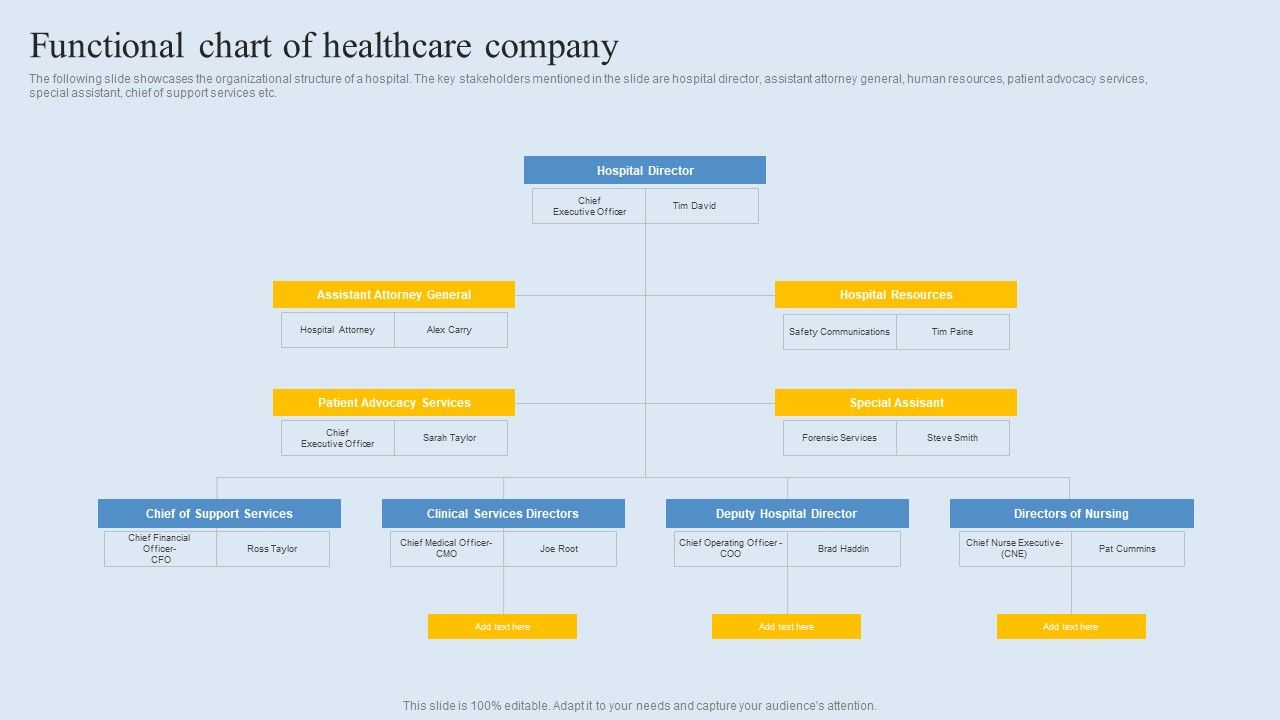 The following slide showcases the organizational structure of a hospital. The key stakeholders mentioned in the slide are hospital director, assistant attorney general, human resources, patient advocacy services, special assistant, chief of support services etc. Coming up with a presentation necessitates that the majority of the effort goes into the content and the message you intend to convey. The visuals of a PowerPoint presentation can only be effective if it supplements and supports the story that is being told. Keeping this in mind our experts created Functional Chart Of Healthcare Company Ideas PDF to reduce the time that goes into designing the presentation. This way, you can concentrate on the message while our designers take care of providing you with the right template for the situation.