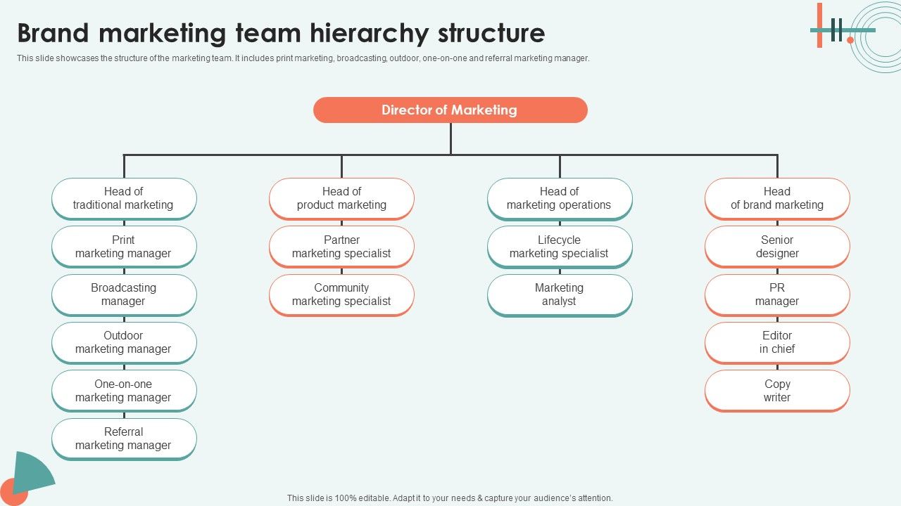 This slide showcases the structure of the marketing team. It includes print marketing, broadcasting, outdoor, one on one and referral marketing manager. Find a pre designed and impeccable Brand Marketing Team Hierarchy Structure Ppt Gallery Templates PDF. The templates can ace your presentation without additional effort. You can download these easy to edit presentation templates to make your presentation stand out from others. So, what are you waiting for Download the template from Slidegeeks today and give a unique touch to your presentation.
