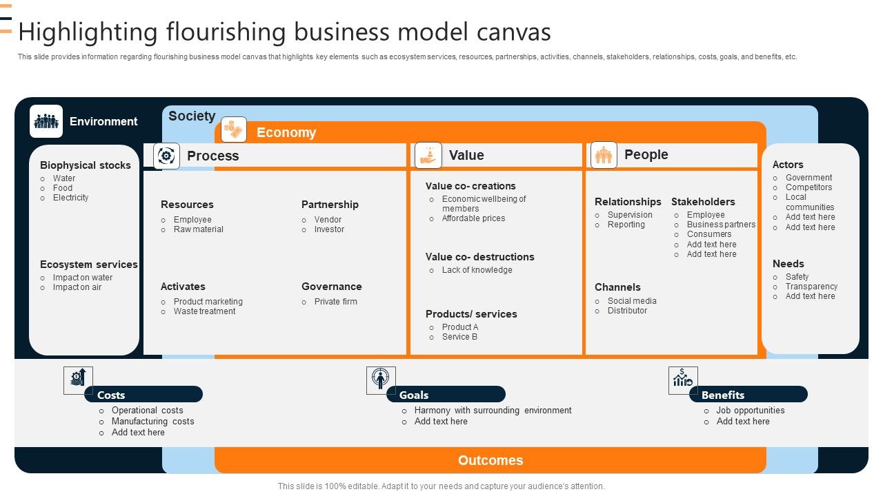 This slide provides information regarding flourishing business model canvas that highlights key elements such as ecosystem services, resources, partnerships, activities, channels, stakeholders, relationships, costs, goals, and benefits, etc. Make sure to capture your audiences attention in your business displays with our gratis customizable Highlighting Flourishing Business Model Canvas Ppt Layouts Topics PDF. These are great for business strategies, office conferences, capital raising or task suggestions. If you desire to acquire more customers for your tech business and ensure they stay satisfied, create your own sales presentation with these plain slides.