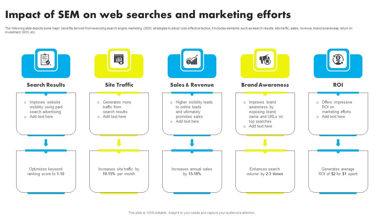 The following slide depicts some major benefits derived from executing search engine marketing SEM strategies to adopt cost-effective tactics. It includes elements such as search results, site traffic, sales, revenue, brand awareness, return on investment ROI etc. This modern and well arranged Impact Of SEM On Web Searches And Marketing Efforts Ppt Show Summary PDF provides lots of creative possibilities. It is very simple to customize and edit with the Powerpoint Software. Just drag and drop your pictures into the shapes. All facets of this template can be edited with Powerpoint no extra software is necessary. Add your own material, put your images in the places assigned for them, adjust the colors, and then you can show your slides to the world, with an animated slide included.