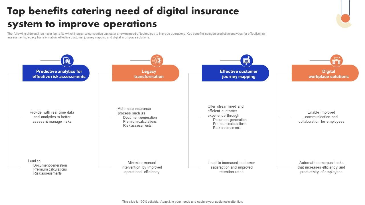 The following slide outlines major benefits which insurance companies can cater showing need of technology to improve operations. Key benefits includes predictive analytics for effective risk assessments, legacy transformation, effective customer journey mapping and digital workplace solutions. Find highly impressive Implementation Of Digital Advancement Techniques Top Benefits Catering Need Of Digital Topics PDF on Slidegeeks to deliver a meaningful presentation. You can save an ample amount of time using these presentation templates. No need to worry to prepare everything from scratch because Slidegeeks experts have already done a huge research and work for you. You need to download Implementation Of Digital Advancement Techniques Top Benefits Catering Need Of Digital Topics PDF for your upcoming presentation. All the presentation templates are 100 percent editable and you can change the color and personalize the content accordingly. Download now.