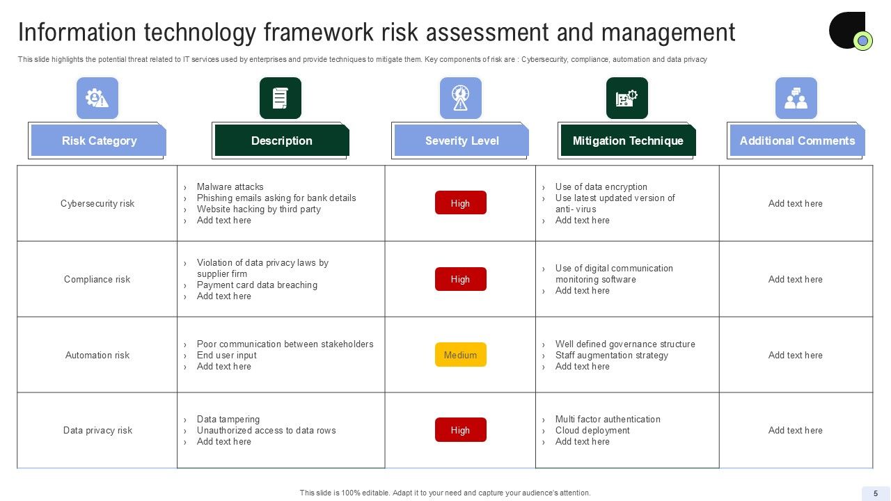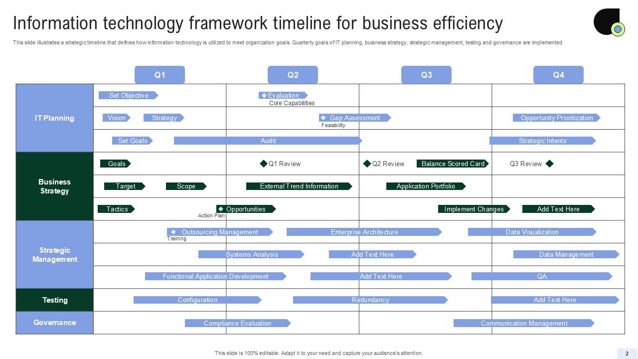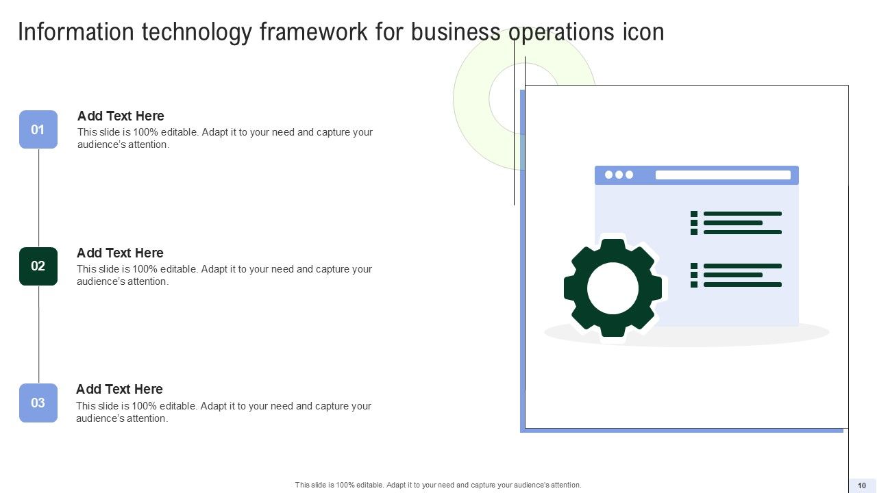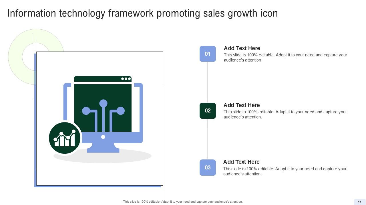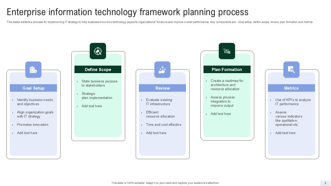 Improve your presentation delivery using this Information Technology Framework Ppt PowerPoint Presentation Complete Deck With Slides. Support your business vision and objectives using this well-structured PPT deck. This template offers a great starting point for delivering beautifully designed presentations on the topic of your choice. Comprising twelve this professionally designed template is all you need to host discussion and meetings with collaborators. Each slide is self-explanatory and equipped with high-quality graphics that can be adjusted to your needs. Therefore, you will face no difficulty in portraying your desired content using this PPT slideshow. This PowerPoint slideshow contains every important element that you need for a great pitch. It is not only editable but also available for immediate download and utilization. The color, font size, background, shapes everything can be modified to create your unique presentation layout. Therefore, download it now.