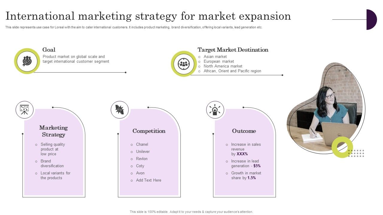 This slide represents use case for Loreal with the aim to cater international customers. It includes product marketing, brand diversification, offering local variants, lead generation etc. Boost your pitch with our creative International Marketing Strategy For Market Expansion Ppt Show Vector PDF. Deliver an awe inspiring pitch that will mesmerize everyone. Using these presentation templates you will surely catch everyones attention. You can browse the ppts collection on our website. We have researchers who are experts at creating the right content for the templates. So you do not have to invest time in any additional work. Just grab the template now and use them.