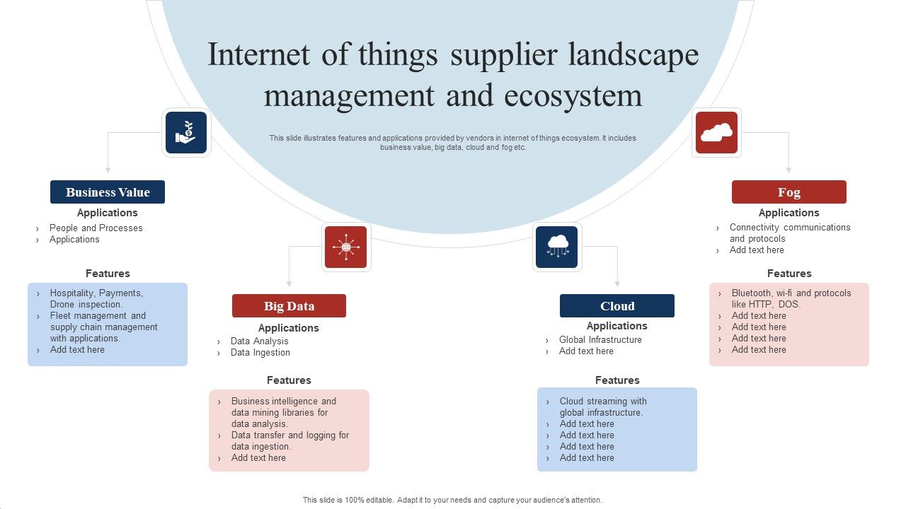 This slide illustrates features and applications provided by vendors in internet of things ecosystem. It includes business value, big data, cloud and fog etc. Persuade your audience using this Internet Of Things Supplier Landscape Management And Ecosystem Professional PDF. This PPT design covers four stages, thus making it a great tool to use. It also caters to a variety of topics including Business Value, Big Data, Cloud. Download this PPT design now to present a convincing pitch that not only emphasizes the topic but also showcases your presentation skills.