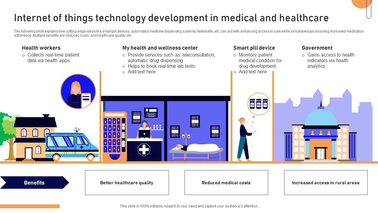 The following slide explains how cutting-edge ideas like smart pill devices, automated medicine dispensing systems, telehealth, etc. can aid with enhancing access to care while simultaneously assuring increased medication adherence. Multiple benefits are reduces costs, and healthcare quality. etc. Showcasing this set of slides titled Internet Of Things Technology Development In Medical And Healthcare Structure PDF. The topics addressed in these templates are Health Workers, Government, Reduced Medical Costs, Better Healthcare Quality, Increased Access Rural Areas. All the content presented in this PPT design is completely editable. Download it and make adjustments in color, background, font etc. as per your unique business setting.