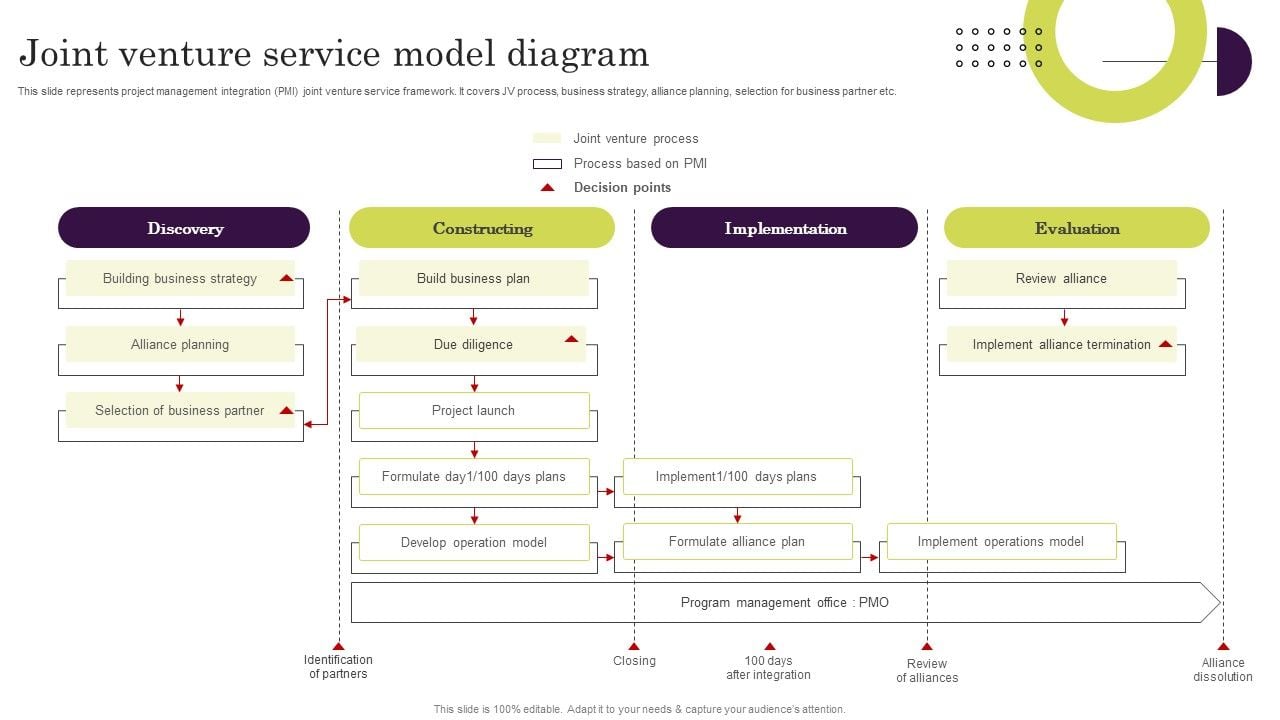This slide represents project management integration PMI joint venture service framework. It covers JV process, business strategy, alliance planning, selection for business partner etc. Take your projects to the next level with our ultimate collection of Joint Venture Service Model Diagram Ppt Infographics Mockup PDF. Slidegeeks has designed a range of layouts that are perfect for representing task or activity duration, keeping track of all your deadlines at a glance. Tailor these designs to your exact needs and give them a truly corporate look with your own brand colors they will make your projects stand out from the rest.