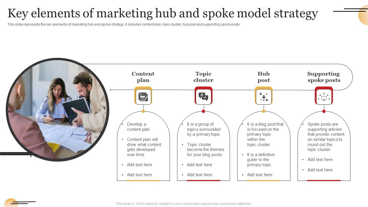 This slide represents the key elements of marketing hub and spoke strategy. It includes content plan, topic cluster, hub post and supporting spoke posts. Persuade your audience using this Key Elements Of Marketing Hub And Spoke Model Strategy Mockup PDF. This PPT design covers four stages, thus making it a great tool to use. It also caters to a variety of topics including Content Plan, Topic Cluster, Hub Post, Supporting Spoke Posts. Download this PPT design now to present a convincing pitch that not only emphasizes the topic but also showcases your presentation skills.