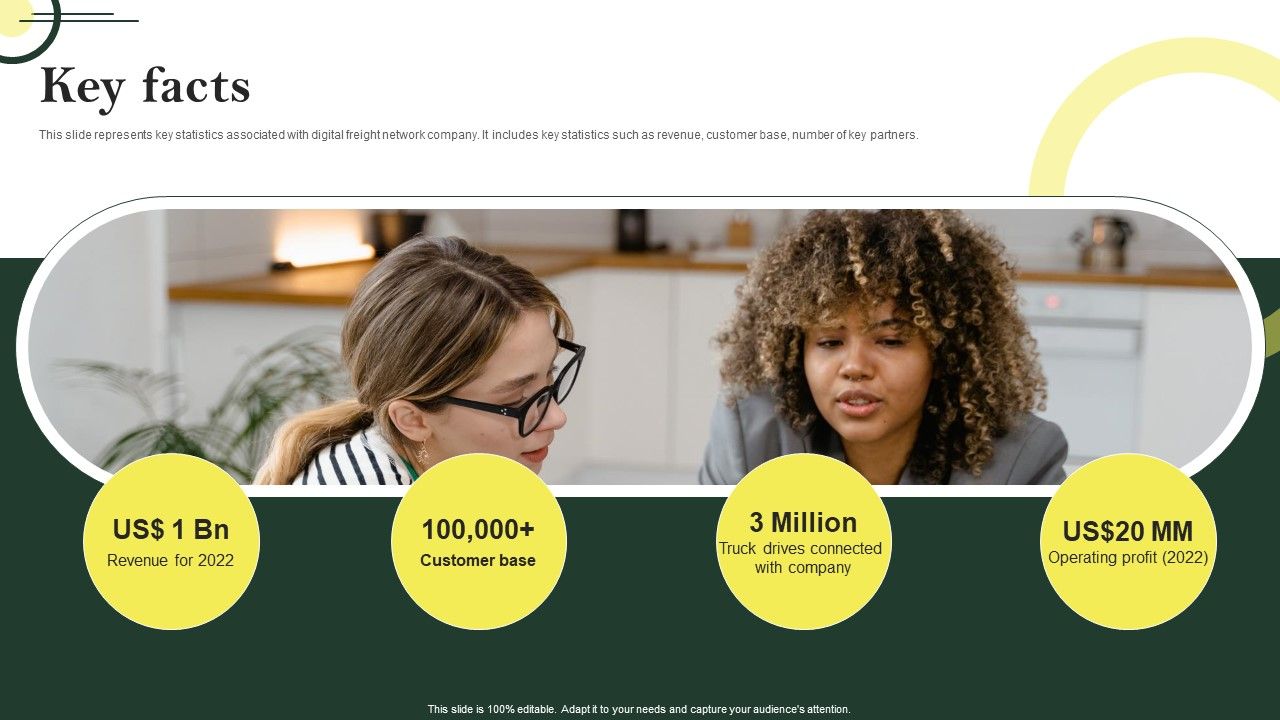 This slide represents key statistics associated with digital freight network company. It includes key statistics such as revenue, customer base, number of key partners. From laying roadmaps to briefing everything in detail, our templates are perfect for you. You can set the stage with your presentation slides. All you have to do is download these easy-to-edit and customizable templates. Key Facts Logistic Company Investor Fund Raising Pitch Deck Pictures PDF will help you deliver an outstanding performance that everyone would remember and praise you for. Do download this presentation today.