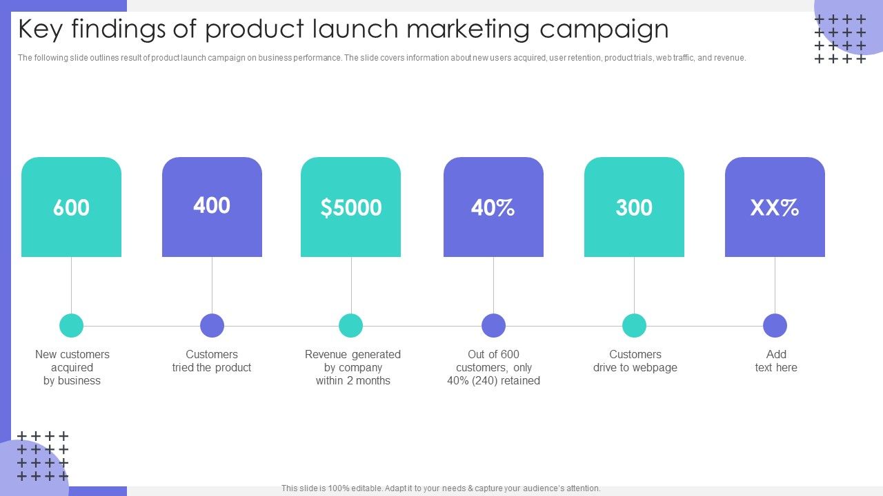The following slide outlines result of product launch campaign on business performance. The slide covers information about new users acquired, user retention, product trials, web traffic, and revenue. The best PPT templates are a great way to save time, energy, and resources. Slidegeeks have 100 percent editable powerpoint slides making them incredibly versatile. With these quality presentation templates, you can create a captivating and memorable presentation by combining visually appealing slides and effectively communicating your message. Download Key Findings Of Product Launch Marketing Campaign Ppt Model Inspiration PDF from Slidegeeks and deliver a wonderful presentation.