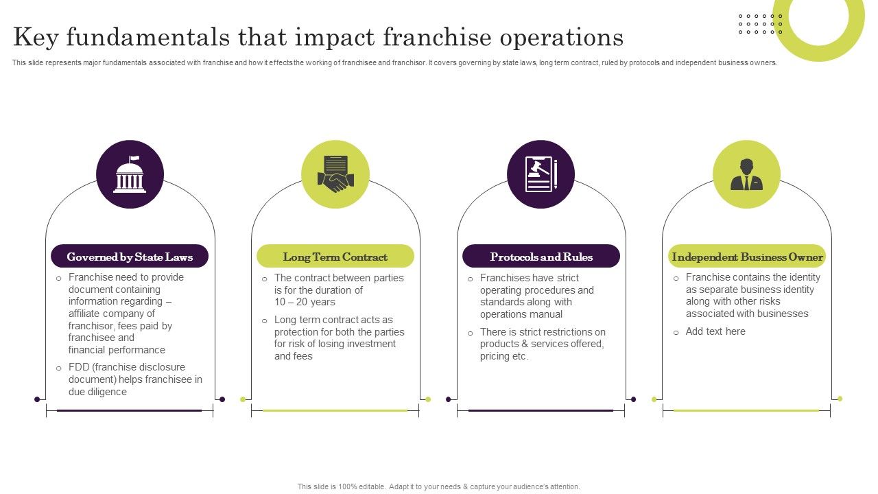 This slide represents major fundamentals associated with franchise and how it effects the working of franchisee and franchisor. It covers governing by state laws, long term contract, ruled by protocols and independent business owners. Want to ace your presentation in front of a live audience Our Key Fundamentals That Impact Franchise Operations Ppt Outline Portrait PDF can help you do that by engaging all the users towards you. Slidegeeks experts have put their efforts and expertise into creating these impeccable powerpoint presentations so that you can communicate your ideas clearly. Moreover, all the templates are customizable, and easy to edit and downloadable. Use these for both personal and commercial use.