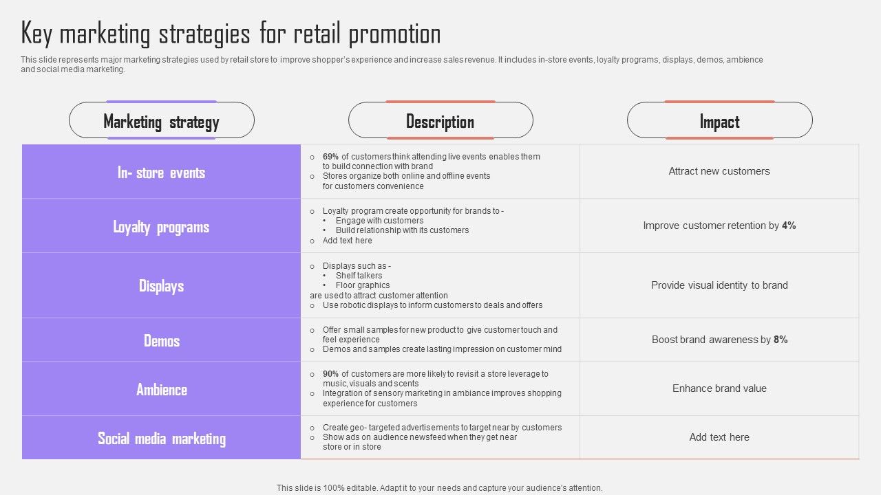 This slide represents major marketing strategies used by retail store to improve shoppers experience and increase sales revenue. It includes in-store events, loyalty programs, displays, demos, ambience and social media marketing. Find highly impressive Key Marketing Strategies For Retail Promotion Optimizing Customer Purchase Experience By Executing Ideas PDF on Slidegeeks to deliver a meaningful presentation. You can save an ample amount of time using these presentation templates. No need to worry to prepare everything from scratch because Slidegeeks experts have already done a huge research and work for you. You need to download Key Marketing Strategies For Retail Promotion Optimizing Customer Purchase Experience By Executing Ideas PDF for your upcoming presentation. All the presentation templates are 100 percent editable and you can change the color and personalize the content accordingly. Download now