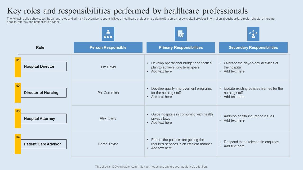 The following slide showcases the various roles and primary and secondary responsibilities of healthcare professionals along with person responsible. It provides information about hospital director, director of nursing, hospital attorney and patient care advisor. The best PPT templates are a great way to save time, energy, and resources. Slidegeeks have 100 percent editable powerpoint slides making them incredibly versatile. With these quality presentation templates, you can create a captivating and memorable presentation by combining visually appealing slides and effectively communicating your message. Download Key Roles And Responsibilities Performed By Healthcare Professionals Pictures PDF from Slidegeeks and deliver a wonderful presentation.
