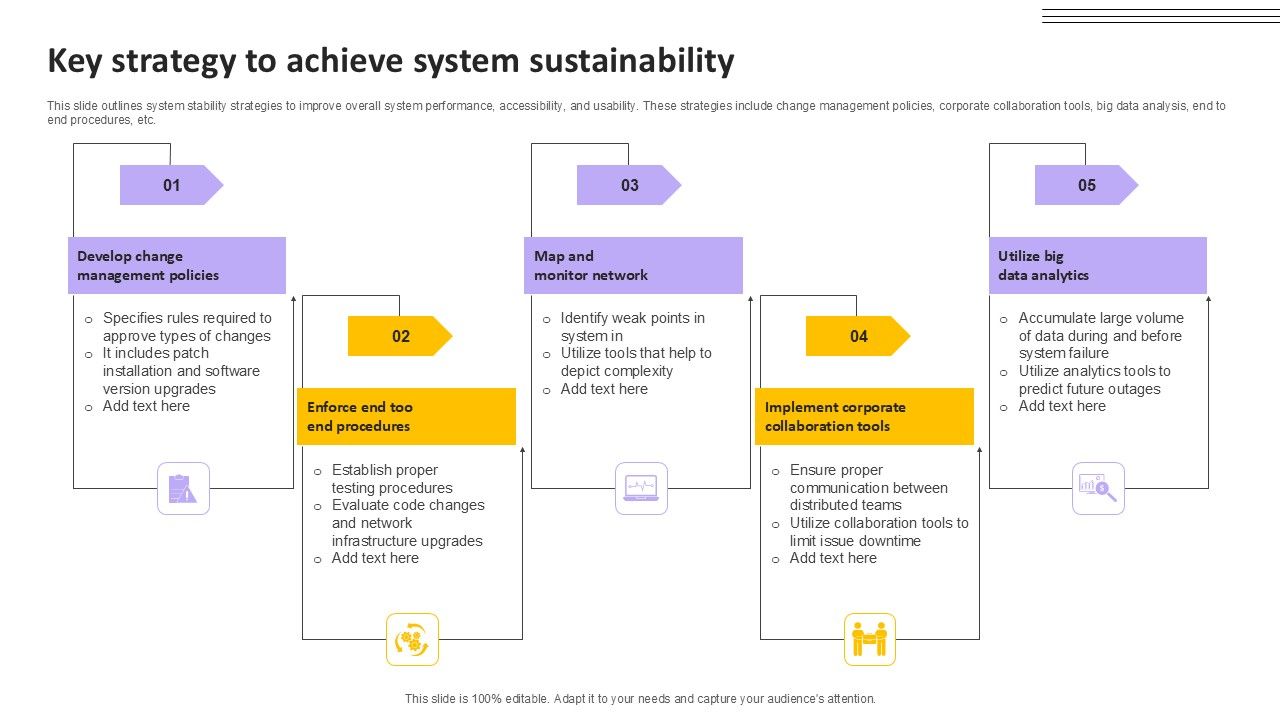 This slide outlines system stability strategies to improve overall system performance, accessibility, and usability. These strategies include change management policies, corporate collaboration tools, big data analysis, end to end procedures, etc. Presenting Key Strategy To Achieve System Sustainability Sample PDF to dispense important information. This template comprises five stages. It also presents valuable insights into the topics including Map Monitor Network, Implement Corporate Collaboration, Utilize Big Data Analytics. This is a completely customizable PowerPoint theme that can be put to use immediately. So, download it and address the topic impactfully.