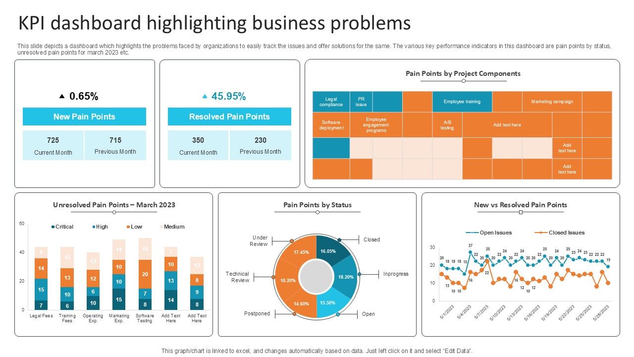 This slide depicts a dashboard which highlights the problems faced by organizations to easily track the issues and offer solutions for the same. The various key performance indicators in this dashboard are pain points by status, unresolved pain points for march 2023 etc. Showcasing this set of slides titled KPI Dashboard Highlighting Business Problems Microsoft PDF. The topics addressed in these templates are Unresolved Pain Points, Resolved Pain Points, Project Components. All the content presented in this PPT design is completely editable. Download it and make adjustments in color, background, font etc. as per your unique business setting.
