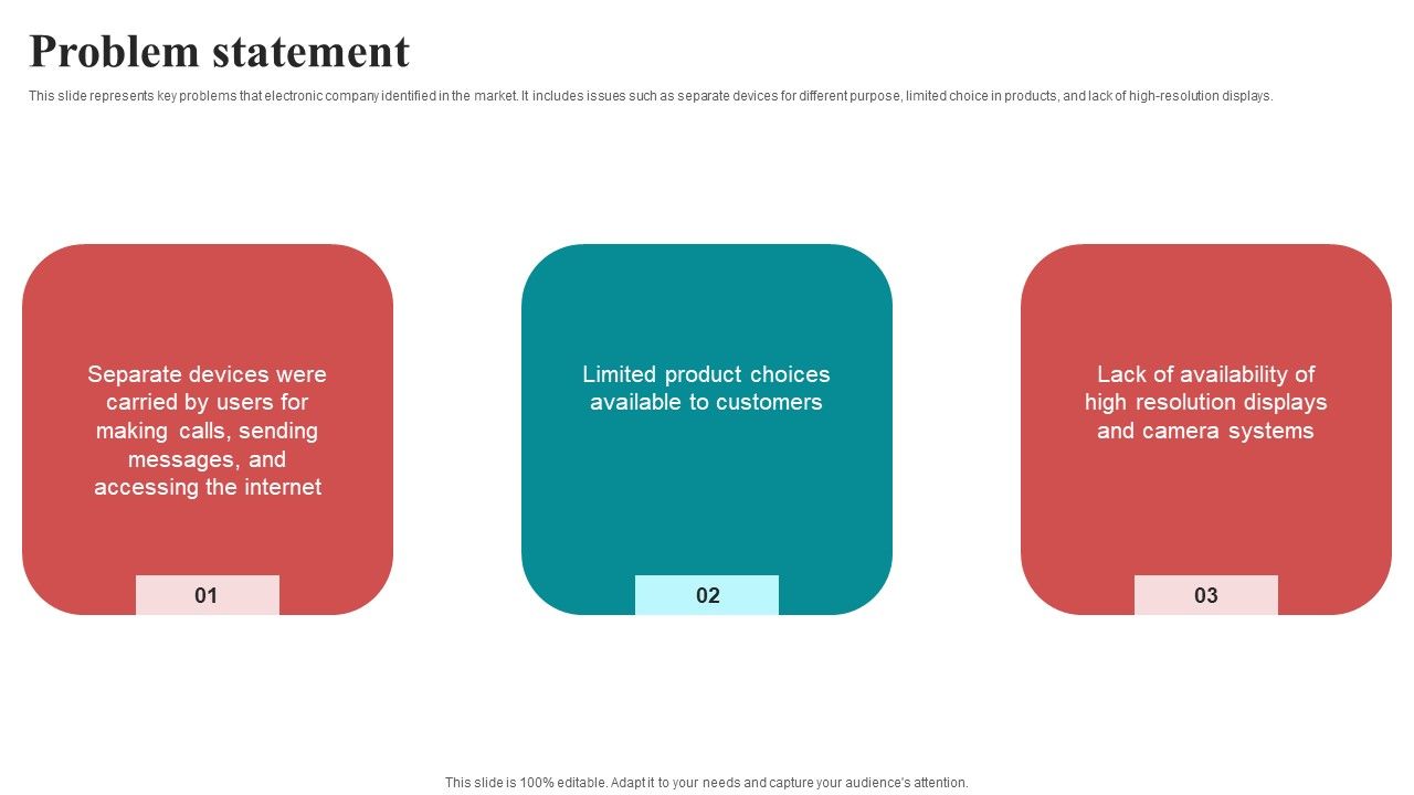 This slide represents key problems that electronic company identified in the market. It includes issues such as separate devices for different purpose, limited choice in products, and lack of high-resolution displays. The best PPT templates are a great way to save time, energy, and resources. Slidegeeks have 100 percent editable powerpoint slides making them incredibly versatile. With these quality presentation templates, you can create a captivating and memorable presentation by combining visually appealing slides and effectively communicating your message. Download Problem Statement Mobile Electronics Fund Raising Pitch Deck Slides PDF from Slidegeeks and deliver a wonderful presentation.