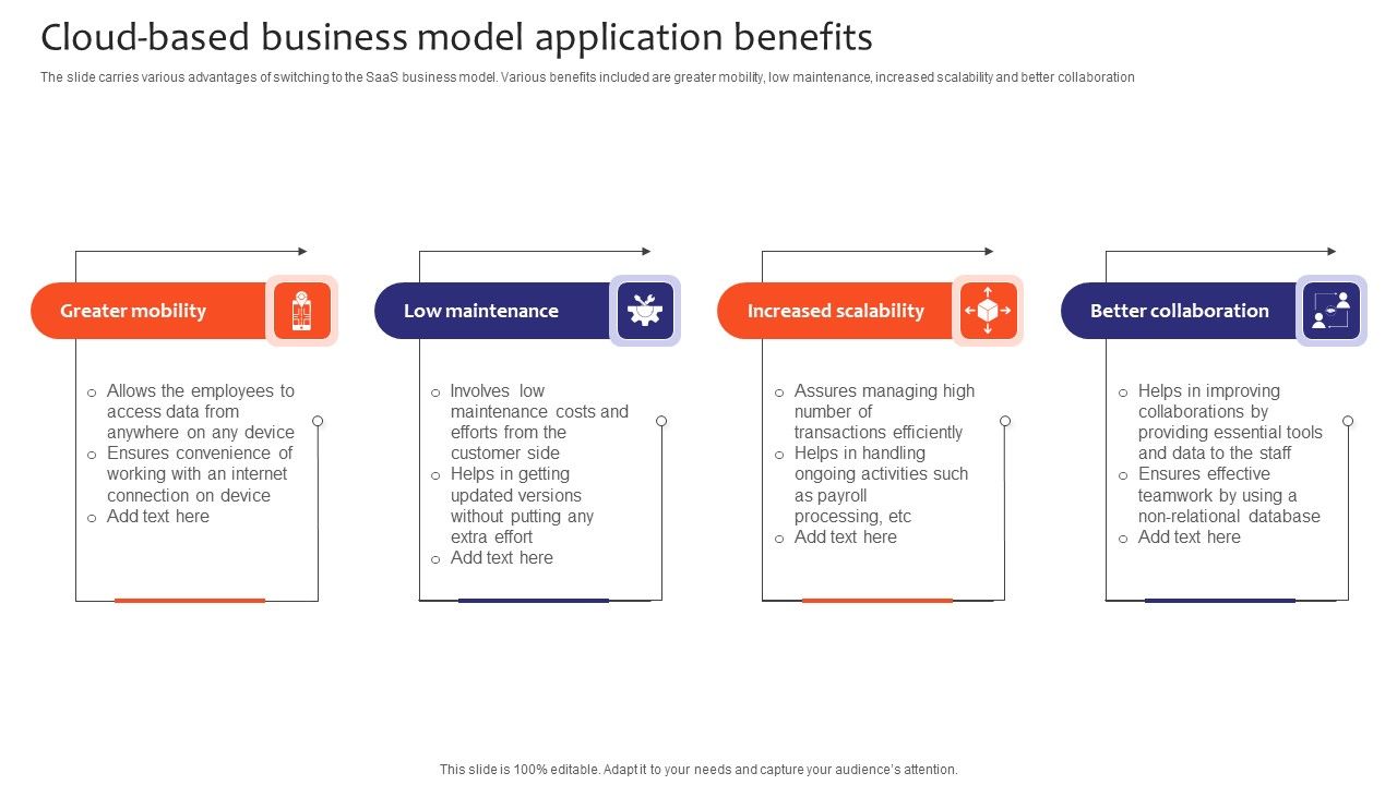 The slide carries various advantages of switching to the SaaS business model. Various benefits included are greater mobility, low maintenance, increased scalability and better collaboration. Presenting Cloud Based Business Model Application Benefits Information PDF to dispense important information. This template comprises four stages. It also presents valuable insights into the topics including Greater Mobility, Low Maintenance, Increased Scalability, Better Collaboration. This is a completely customizable PowerPoint theme that can be put to use immediately. So, download it and address the topic impactfully.