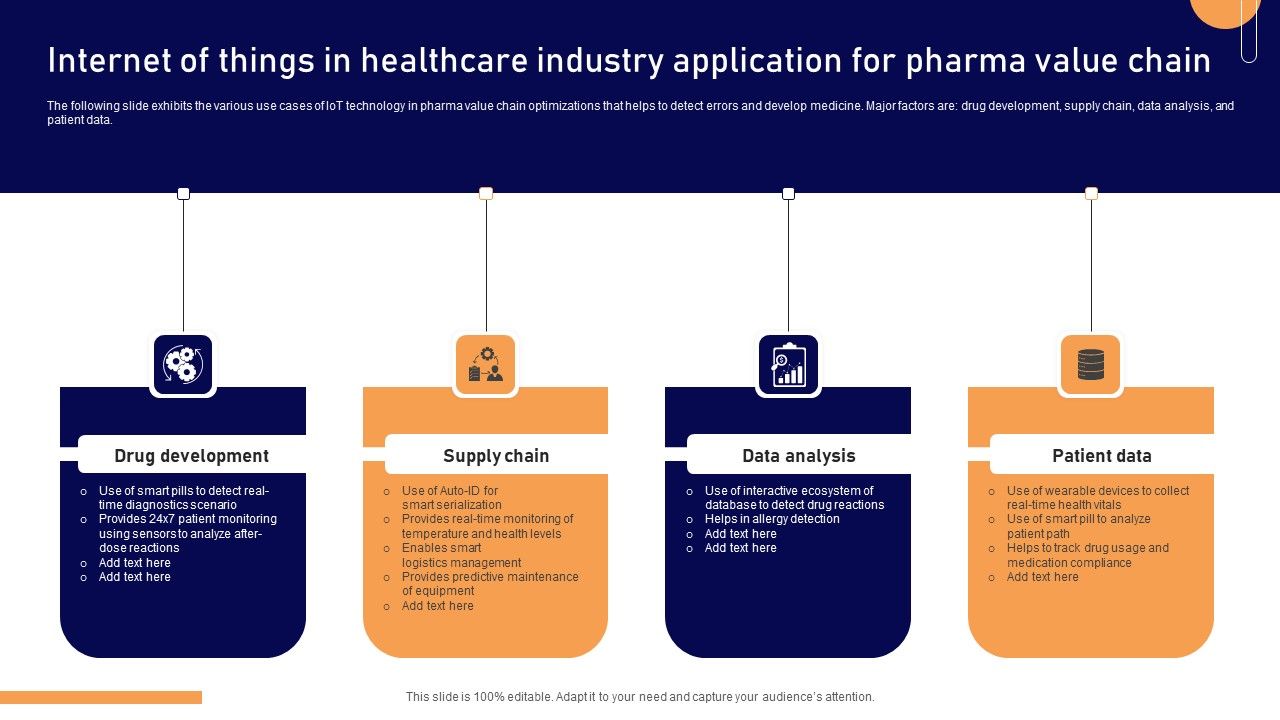 The following slide exhibits the various use cases of IoT technology in pharma value chain optimizations that helps to detect errors and develop medicine. Major factors are drug development, supply chain, data analysis, and patient data. Presenting Internet Of Things In Healthcare Industry Application For Pharma Value Chain Themes PDF to dispense important information. This template comprises four stages. It also presents valuable insights into the topics including Drug Development, Supply Chain, Data Analysis, Patient Data. This is a completely customizable PowerPoint theme that can be put to use immediately. So, download it and address the topic impactfully.