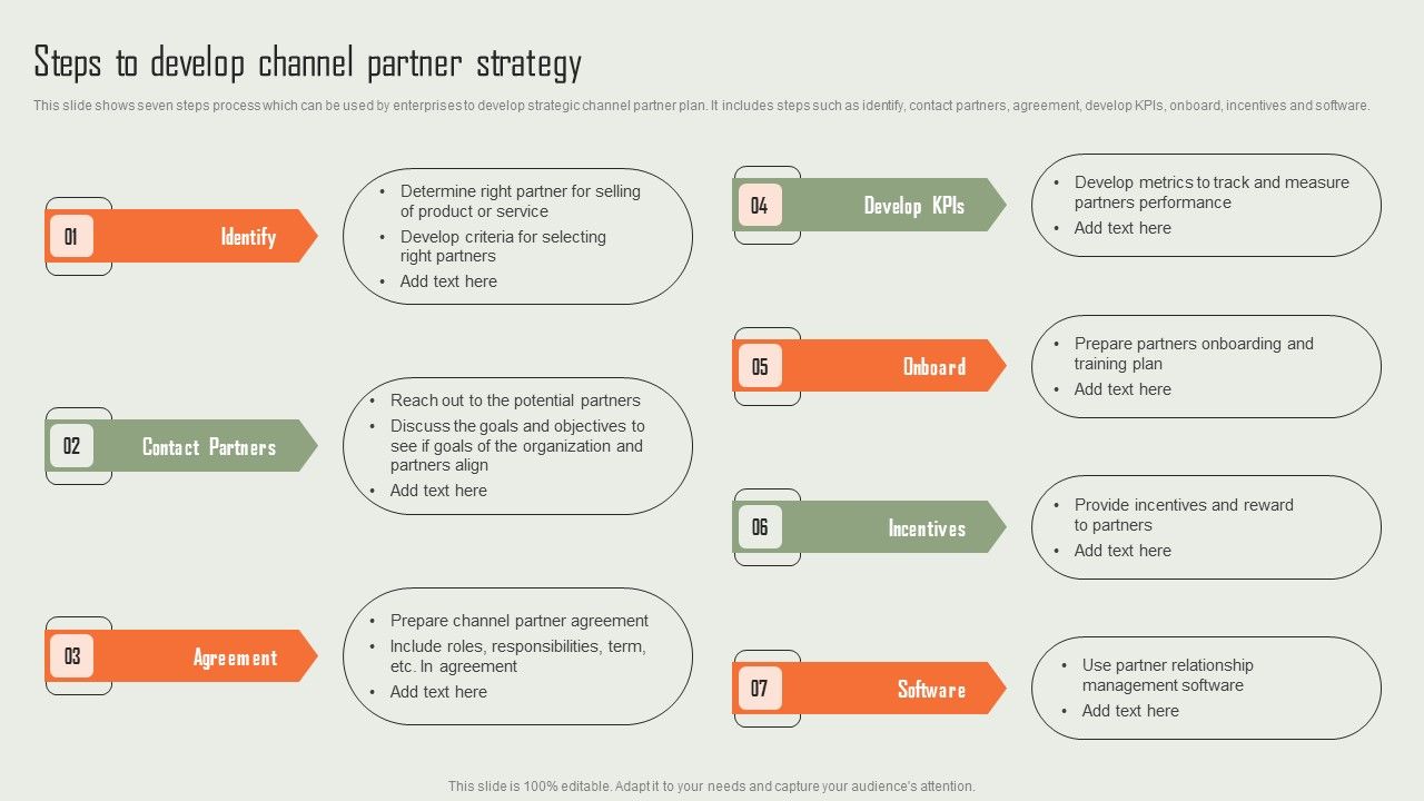 This slide shows seven steps process which can be used by enterprises to develop strategic channel partner plan. It includes steps such as identify, contact partners, agreement, develop KPIs, onboard, incentives and software. Find a pre designed and impeccable Product Marketing And Sales Expansion Through Channel Steps To Develop Channel Partner Strategy Structure PDF. The templates can ace your presentation without additional effort. You can download these easy to edit presentation templates to make your presentation stand out from others. So, what are you waiting for Download the template from Slidegeeks today and give a unique touch to your presentation.