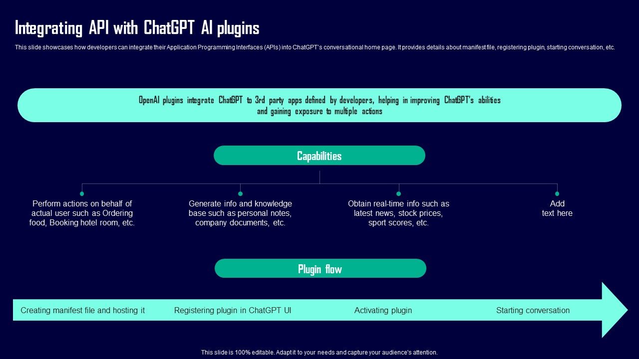 This slide showcases how developers can integrate their Application Programming Interfaces APIs into ChatGPTs conversational home page. It provides details about manifest file, registering plugin, starting conversation, etc. This modern and well arranged Leveraging Openai API For Business Integrating API With Chatgpt AI Plugins Pictures PDF provides lots of creative possibilities. It is very simple to customize and edit with the Powerpoint Software. Just drag and drop your pictures into the shapes. All facets of this template can be edited with Powerpoint no extra software is necessary. Add your own material, put your images in the places assigned for them, adjust the colors, and then you can show your slides to the world, with an animated slide included.